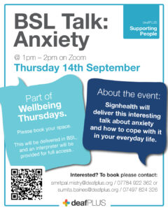 This event is part of wellbeing Thursdays. This will be delivered in BSL and an interpreter will be provided for full access. Signhealth will deliver this interesting talk about anxiety and how to cope with it in your everyday life.